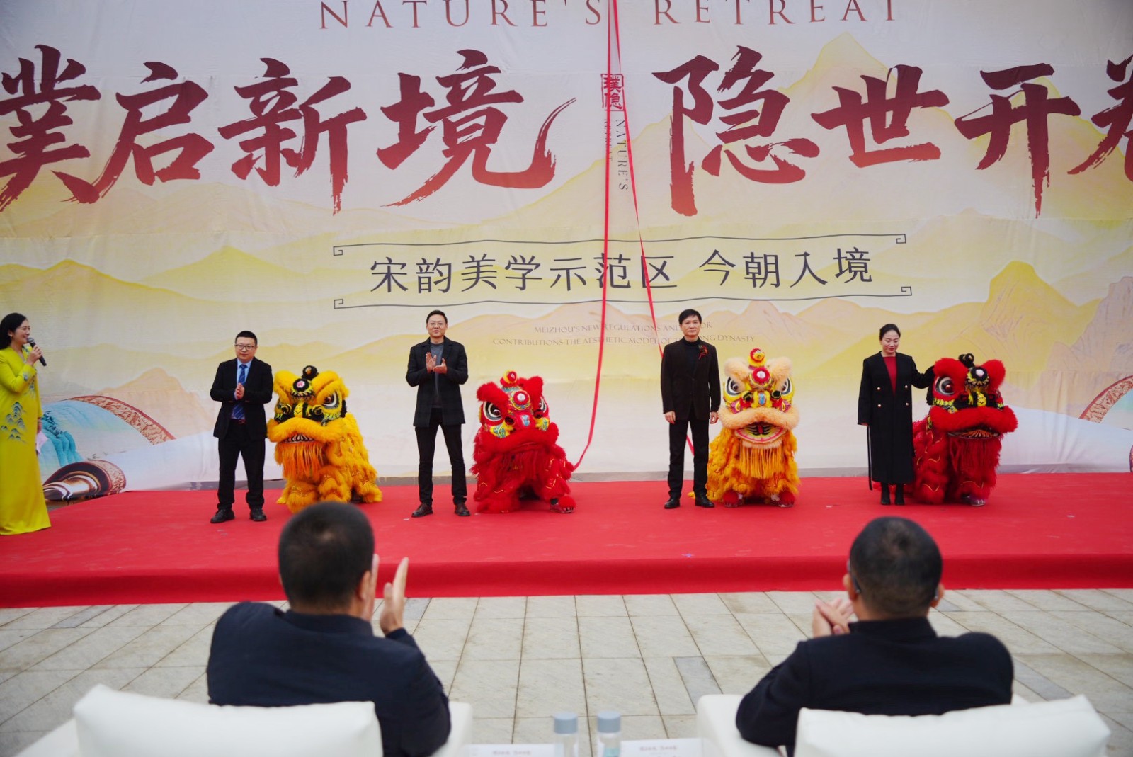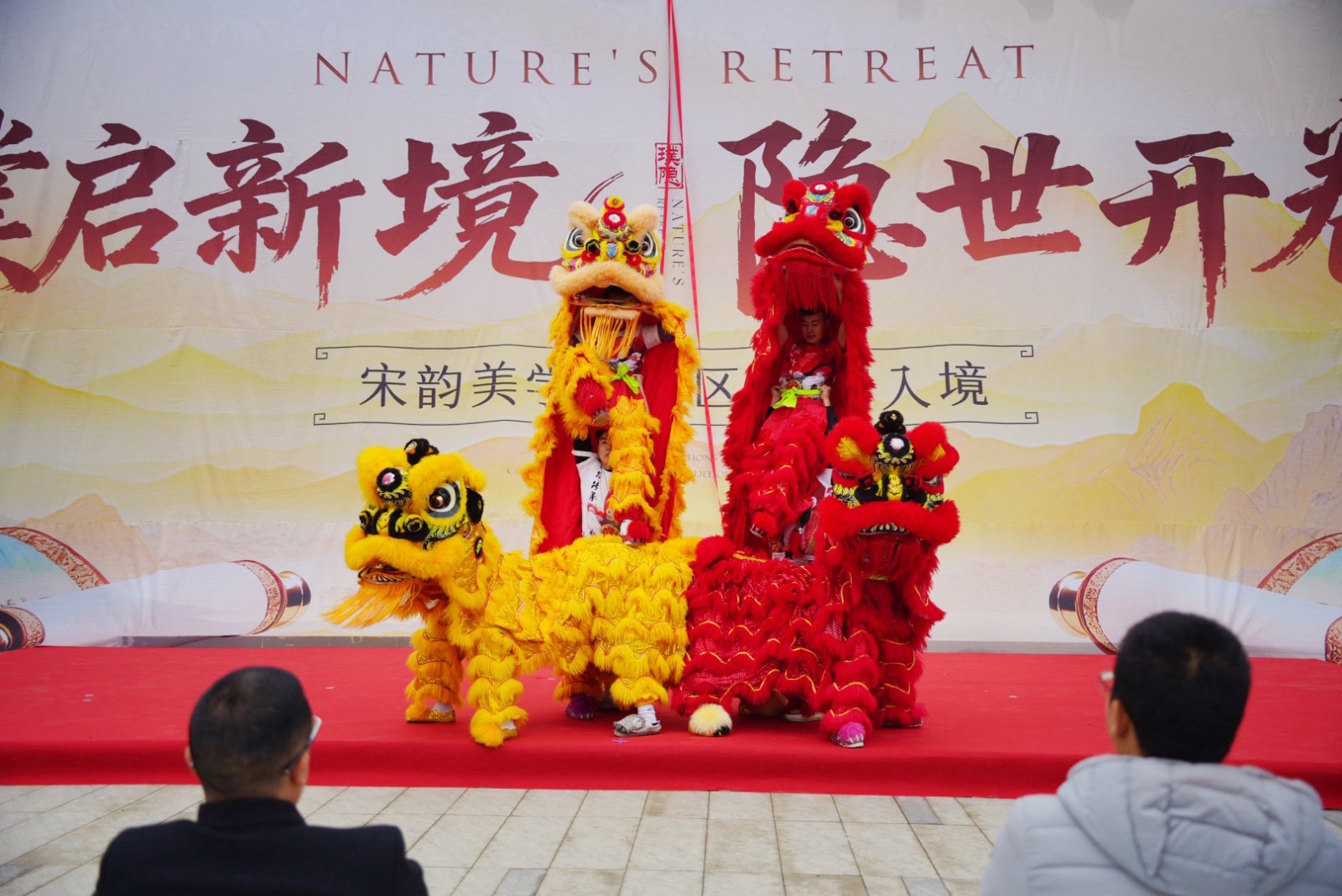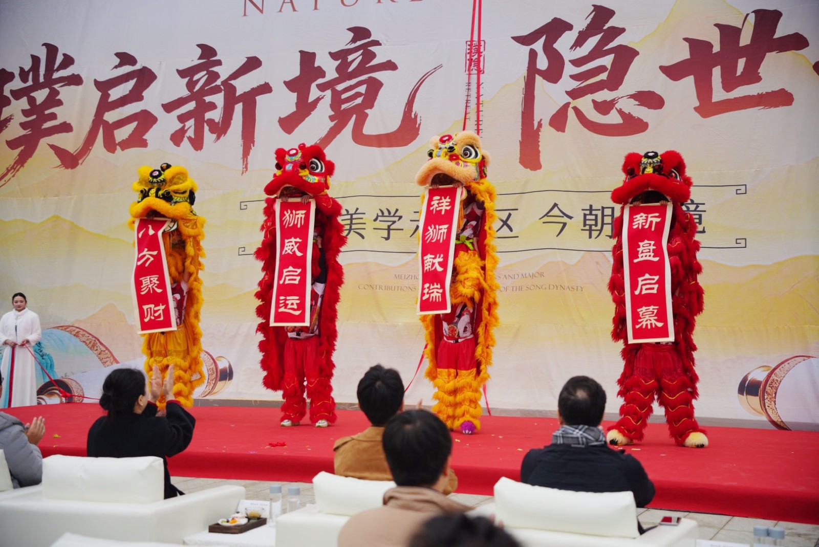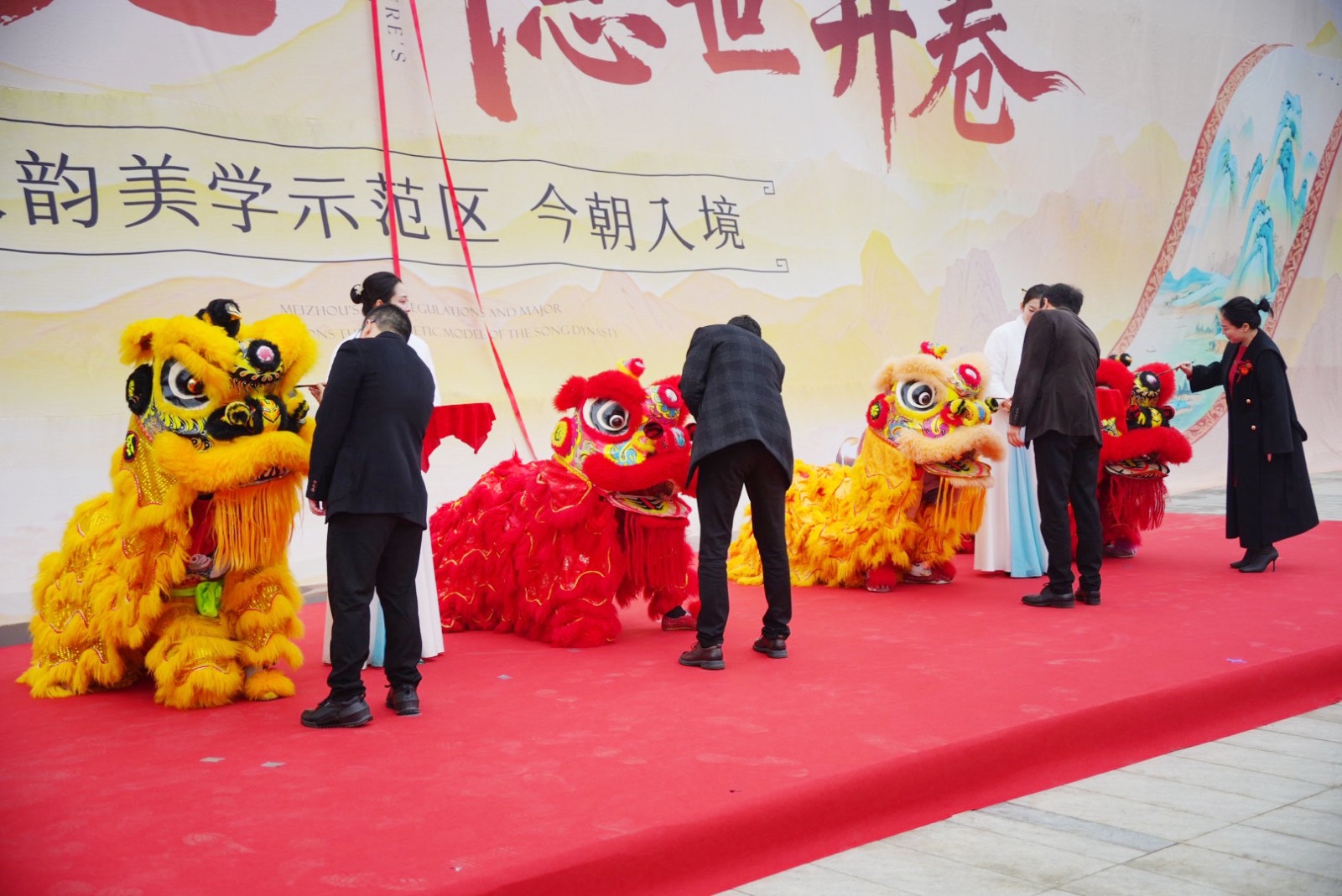 随后,在“雄狮献瑞”环节中,灵眸既启的祥狮随鼓点腾跃起舞,步伐刚柔并济,节奏动静相生,将万千吉祥洒落于此方天地。狮舞礼成后,主礼嘉宾共同执起锦帛,为下一环节的揭幕仪式做好铺垫。