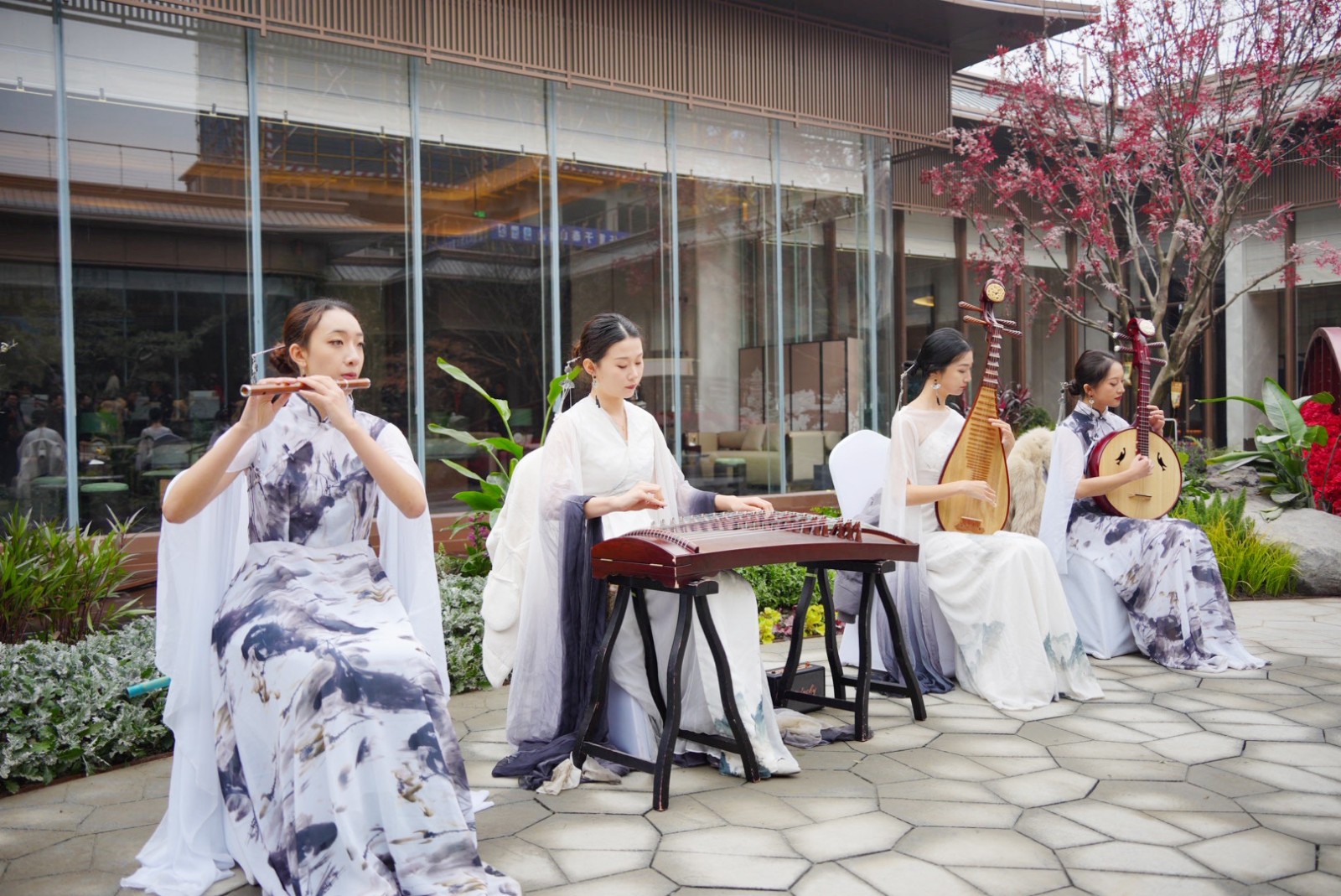 后续时段,嘉宾们自由游览,欣赏民乐伴奏、抚琴焚香,品尝东坡盛宴、参与插花互动,体验会所瑜伽、健身等多项精彩活动,现场氛围典雅而热烈,下沉庭院景观更是吸引众多嘉宾游览拍照,流连忘返。