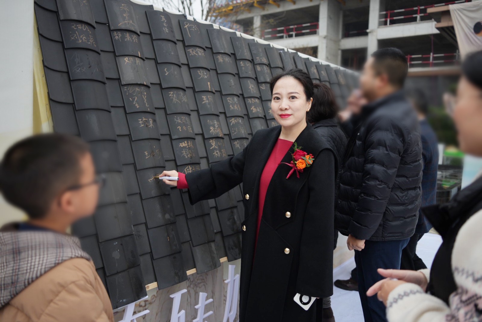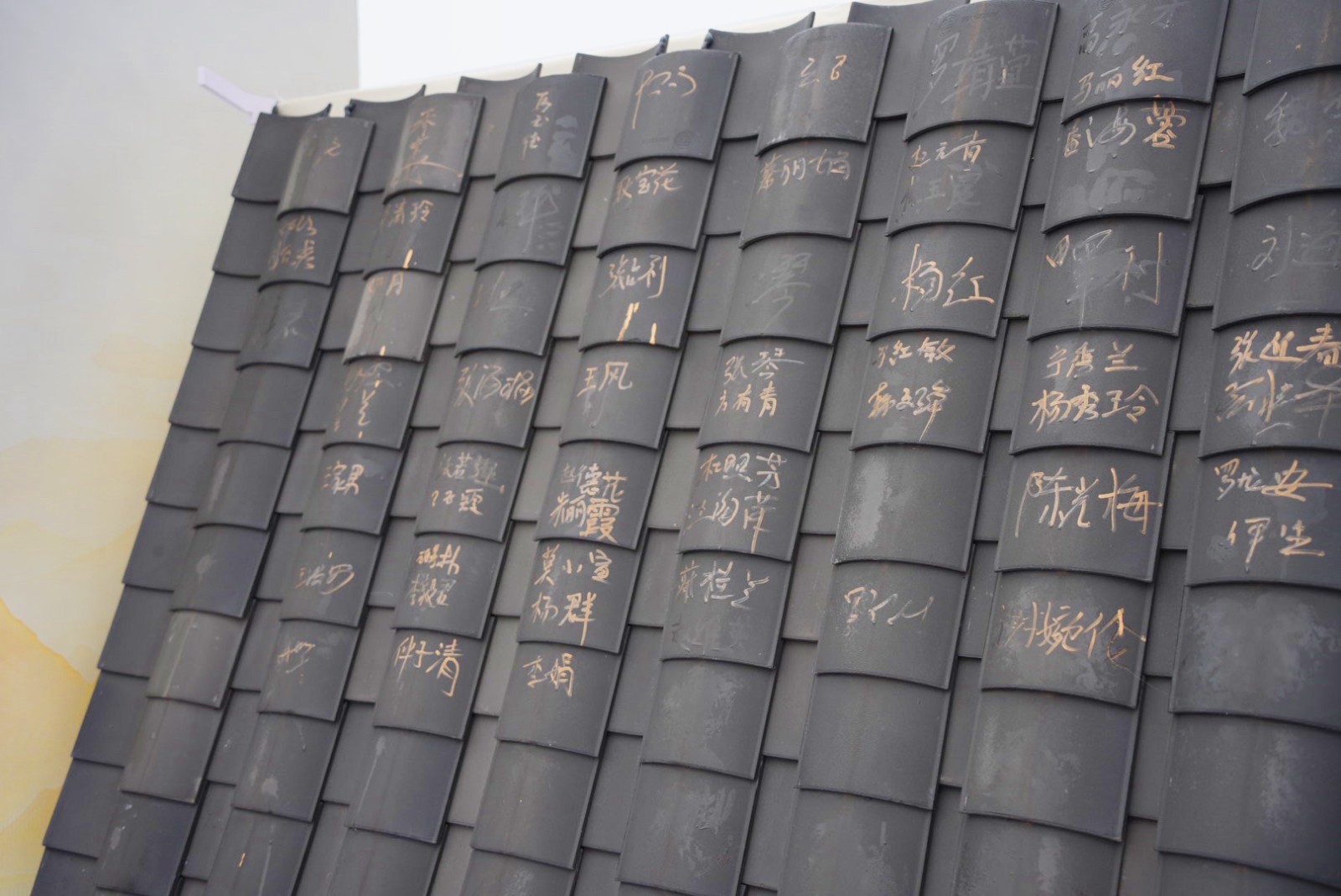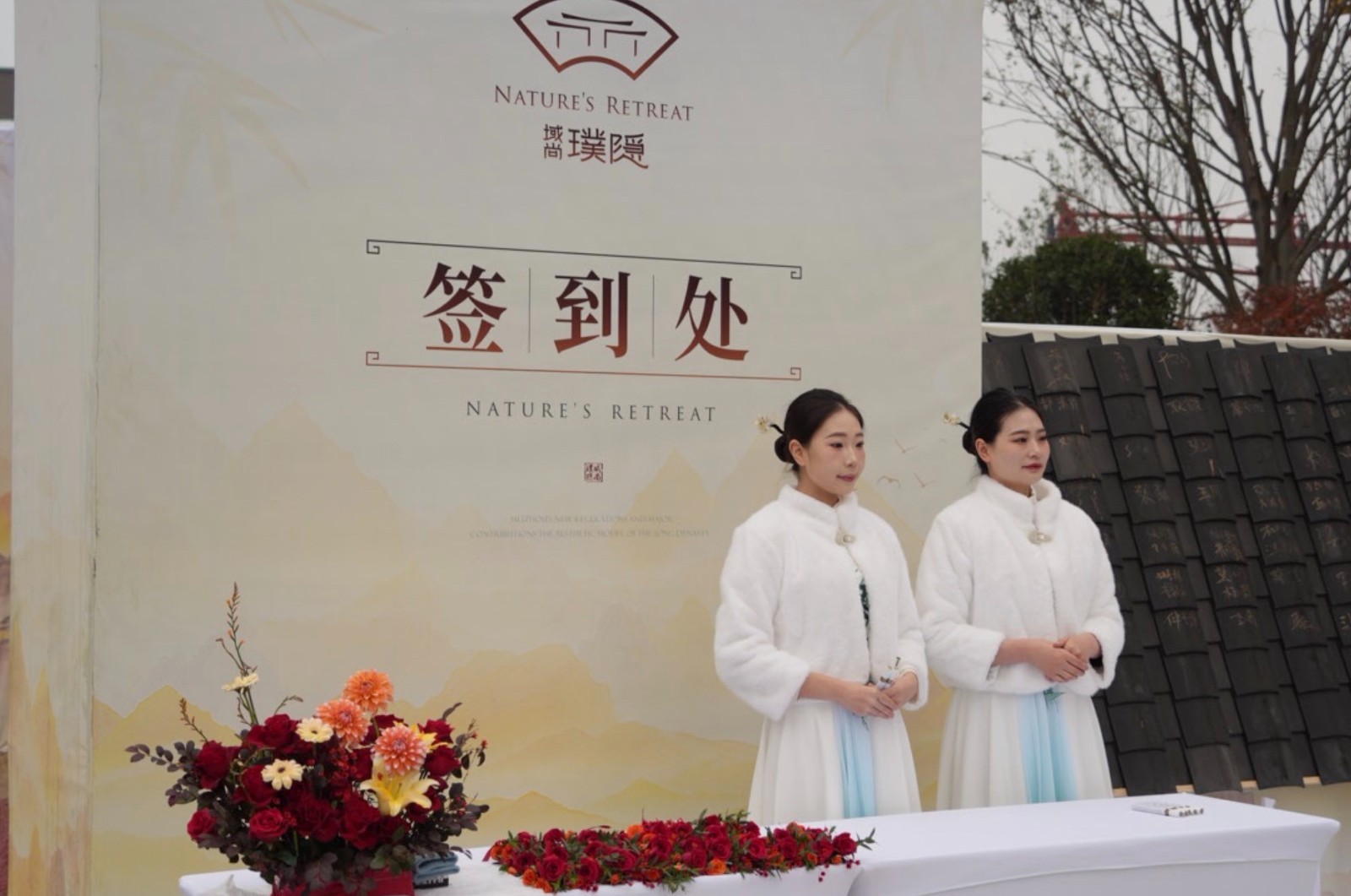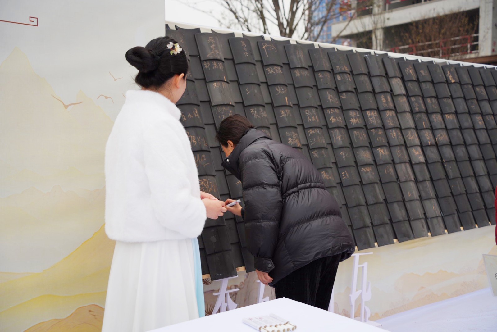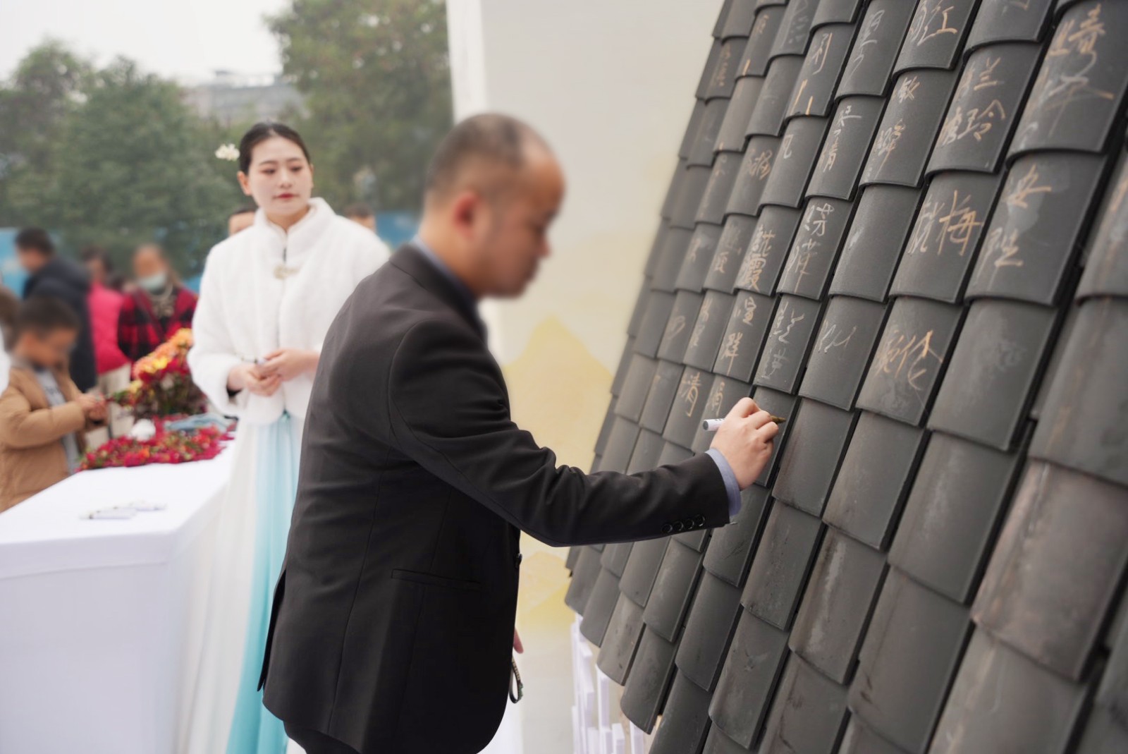 活动伊始,自9:00起,嘉宾们陆续抵达。在独具匠心的签到处,一场寓意深远的“添砖加瓦”仪式徐徐展开——每位嘉宾在特制的青灰瓦片上郑重签名,笔墨落处,不仅是为这座即将绽放的宋韵雅境“添砖加瓦”,更象征着共同构筑理想人居的美好期许。
