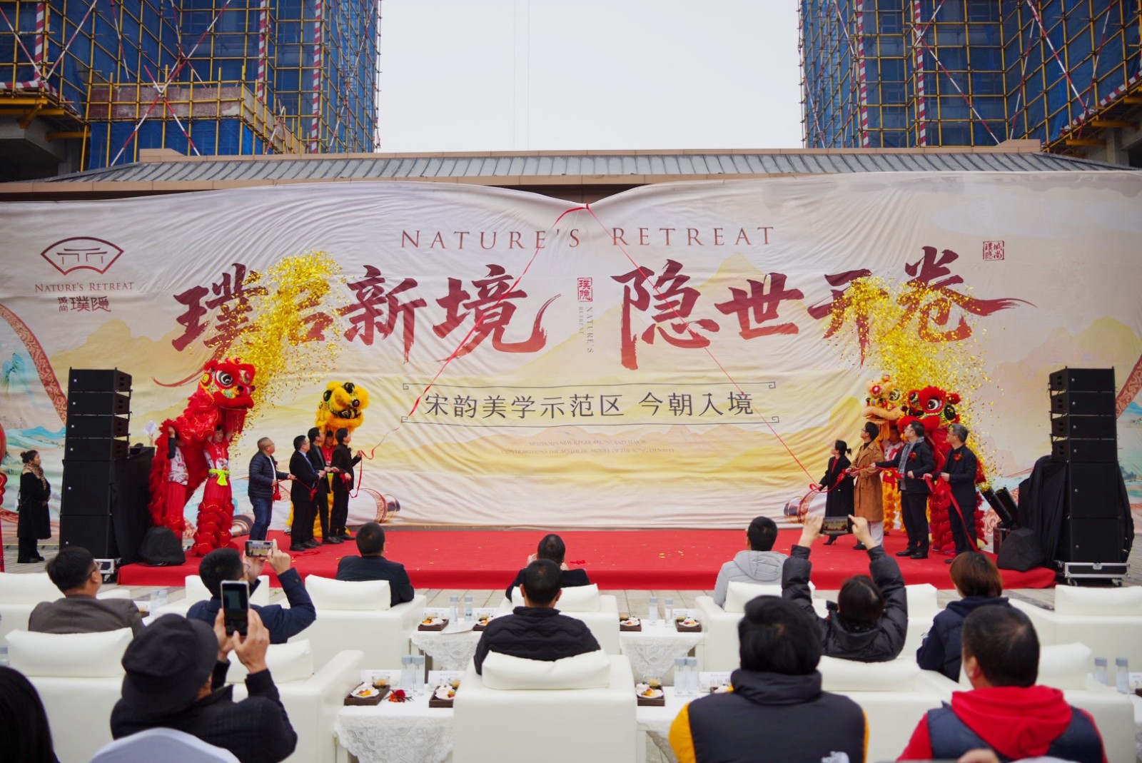 10:28分,吉时已至,揭幕仪式正式开始。在全场嘉宾的凝神注目下,随着倒计时声起,主礼嘉宾共同拉下帷幕,域尚·璞隐宋韵美学示范区的神秘面纱被徐徐揭开。这一揭,不仅象征着项目正式对外开放,更标志着东方美学在当代的延续与新生。